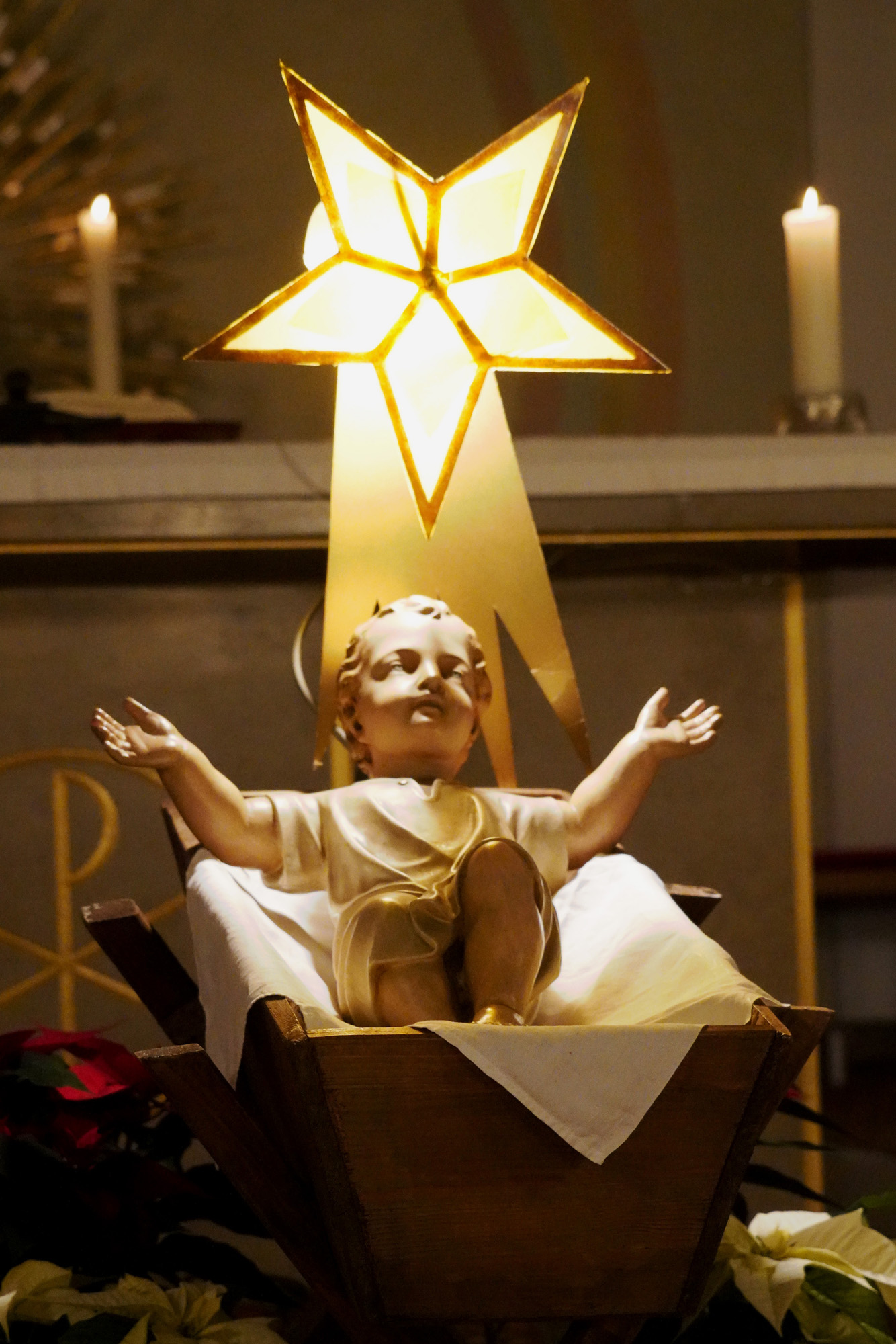 Die Instrumentalgruppe läutete traditionell mit dem „Christkindlanblasen“ den heiligen Abend in St. Johannes ein. Die Christmette startete mit dem feierlichen Einzug von Monsignore Andreas Uschold und dem liturgischen Dienst in die festlich erleuchtete Pfarrkirche, wo sie bereits vom Kind in der Krippe vor dem Altar erwartet wurden.