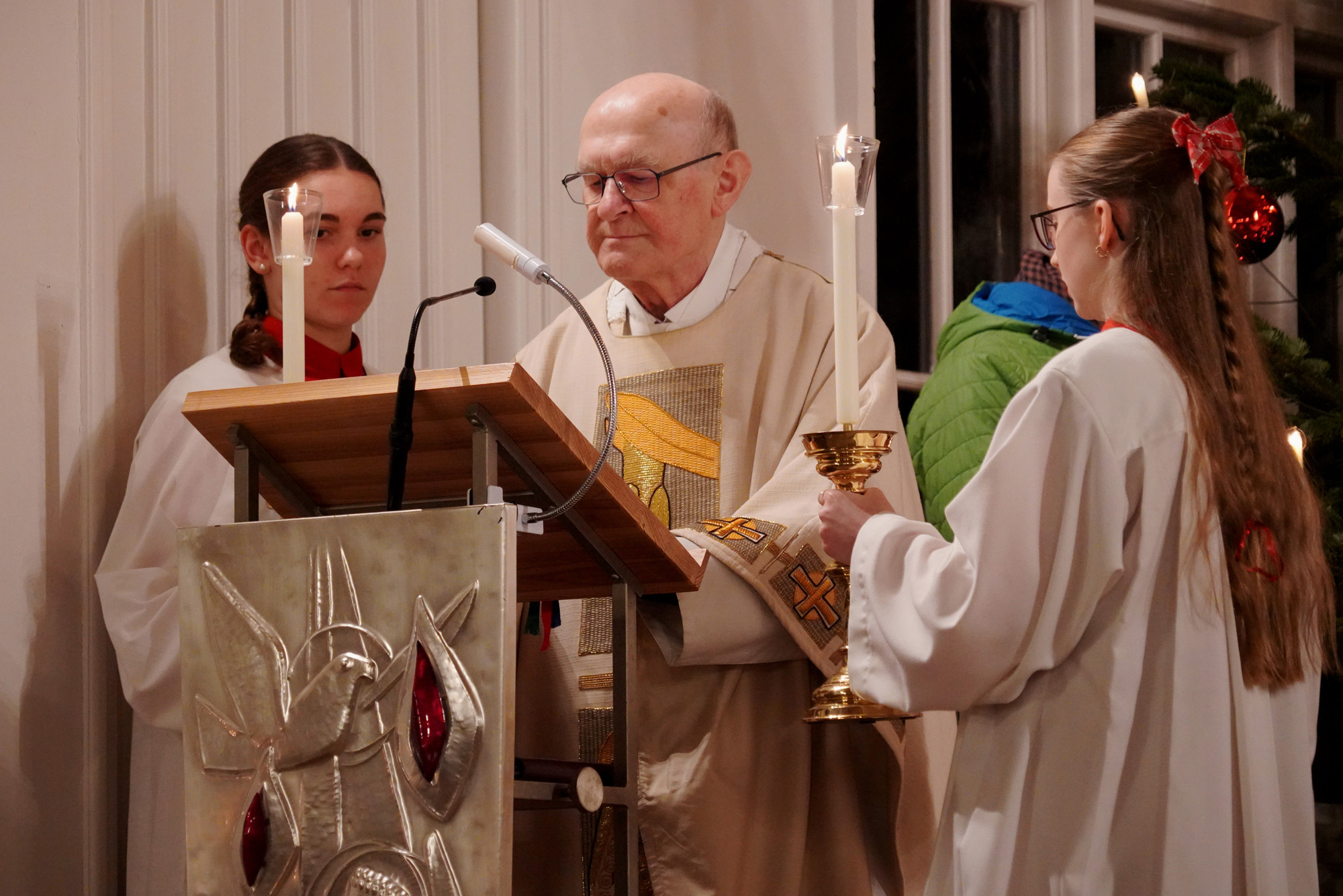 In seiner Predigt stellte Pfarrer i.R. Uschold die Frohbotschaft von der Geburt Jesu in den Mittelpunkt und rief die Gläubigen auf, der Liebe Gottes zu vertrauen.