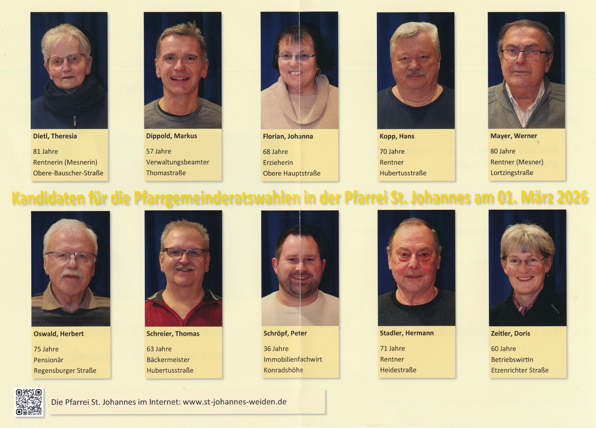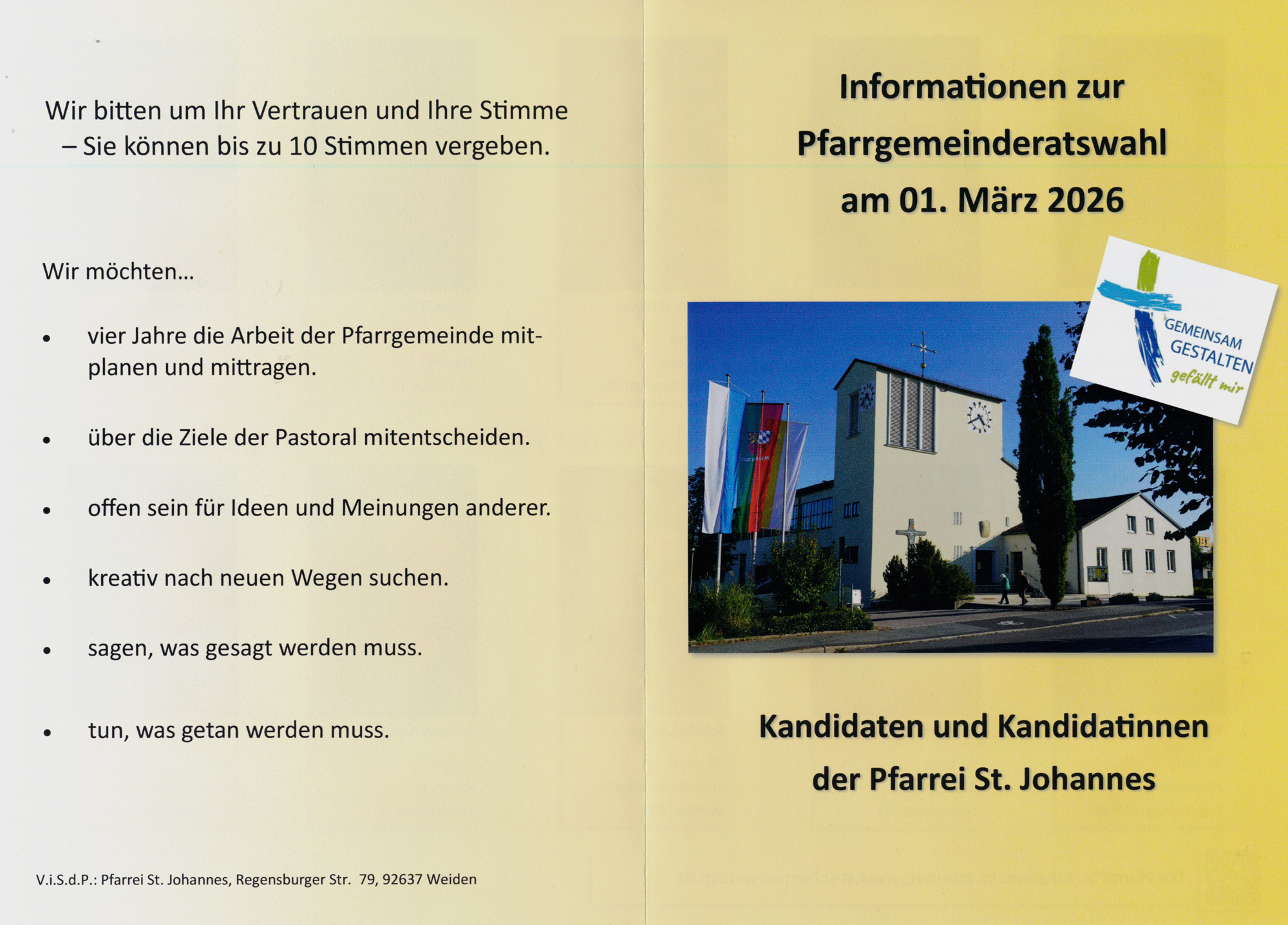 Die Wahlunterlagen für die Pfarrgemeinderatswahlen sind eingetütet und zugestellt. Alle Pfarrangehörigen sind herzlich eingeladen, ihre Stimme abzugeben und so ihr Interesse am Leben der Pfarrei St. Johannes zu zeigen. Wir sind froh, dass sich wieder zehn Frauen und Männer für den Pfarrgemeinderat in den nächsten vier Jahren zur Verfügung stellen.