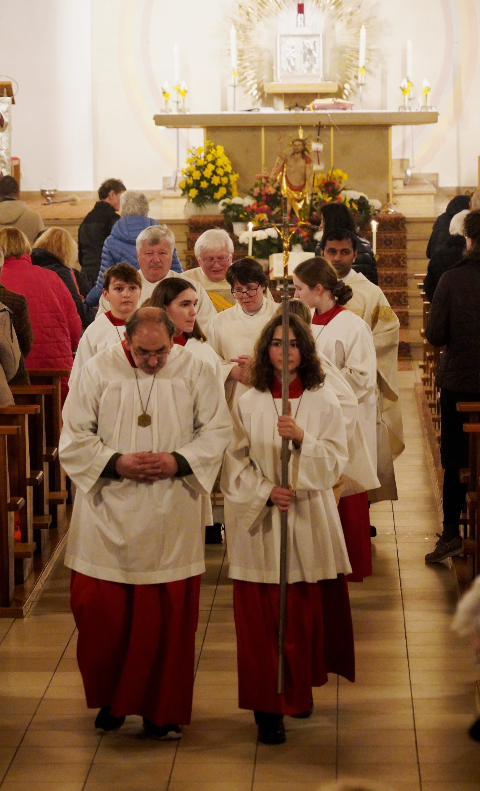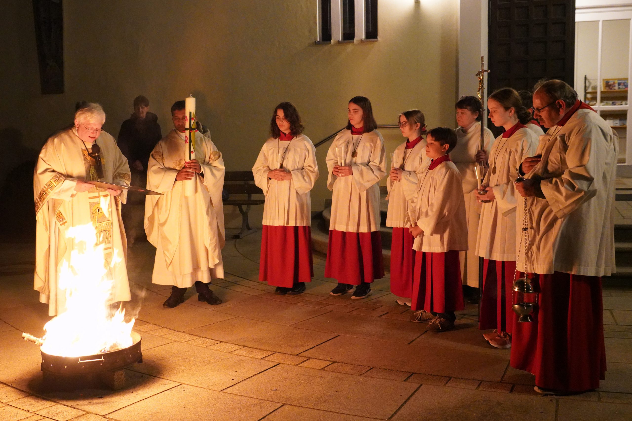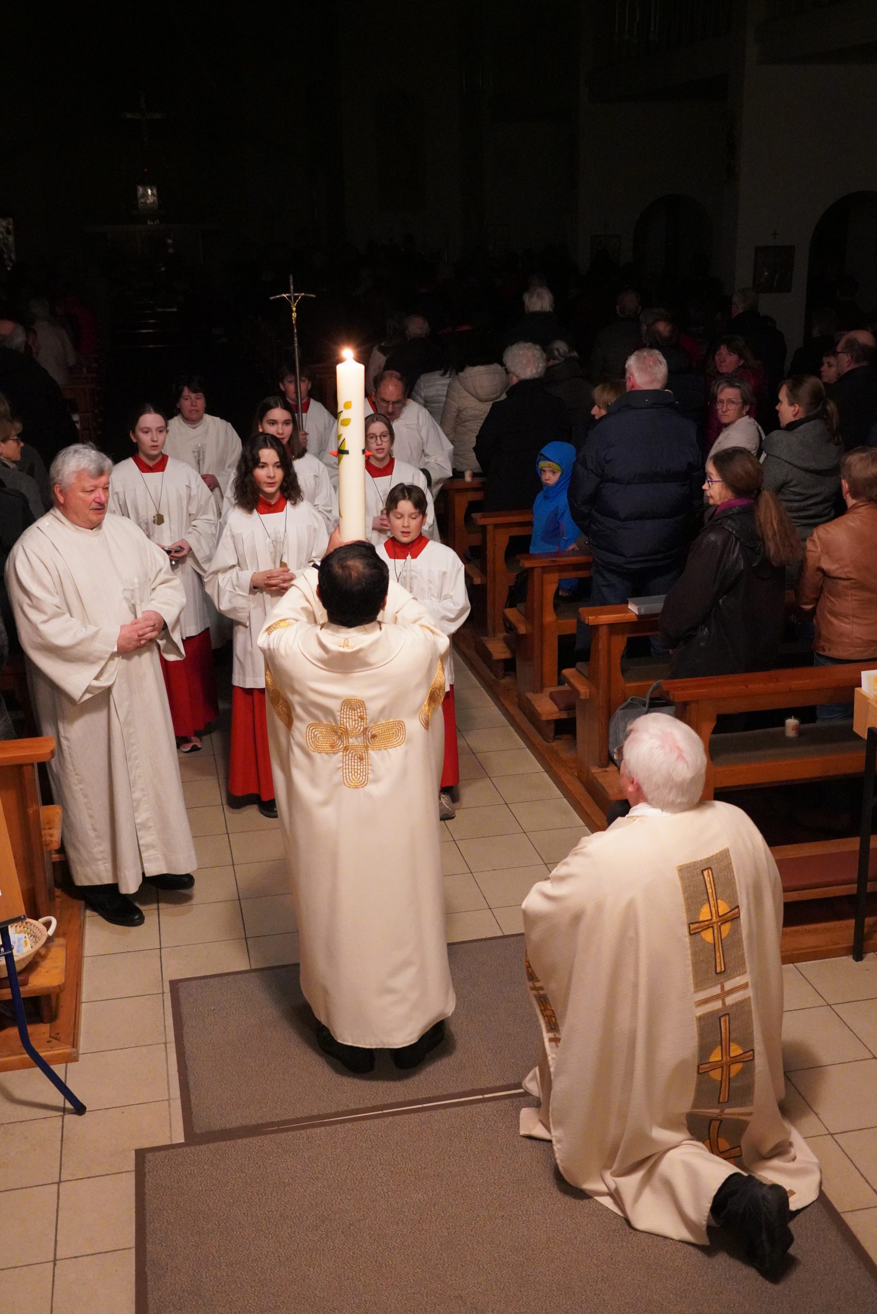 Die Feier der Osternacht wurde mit der Segnung des Osterfeuers und dem Entzünden der Osterkerze auf dem Kirchplatz eingeleitet. Nach den altvertrauten Lesungen ertönte mit dem Gloria wieder die Orgel und alle Glocken läuteten. „Christus ist erstanden“ war die frohe Botschaft der Osternachtfeier, die von Stadtpfarrer Gottfried Schubach, Pfarrvikar Jomet Joy und Chordirektor Peter Kosmus festlich gestaltet und von vielen Gläubigen mitgefeiert wurde.