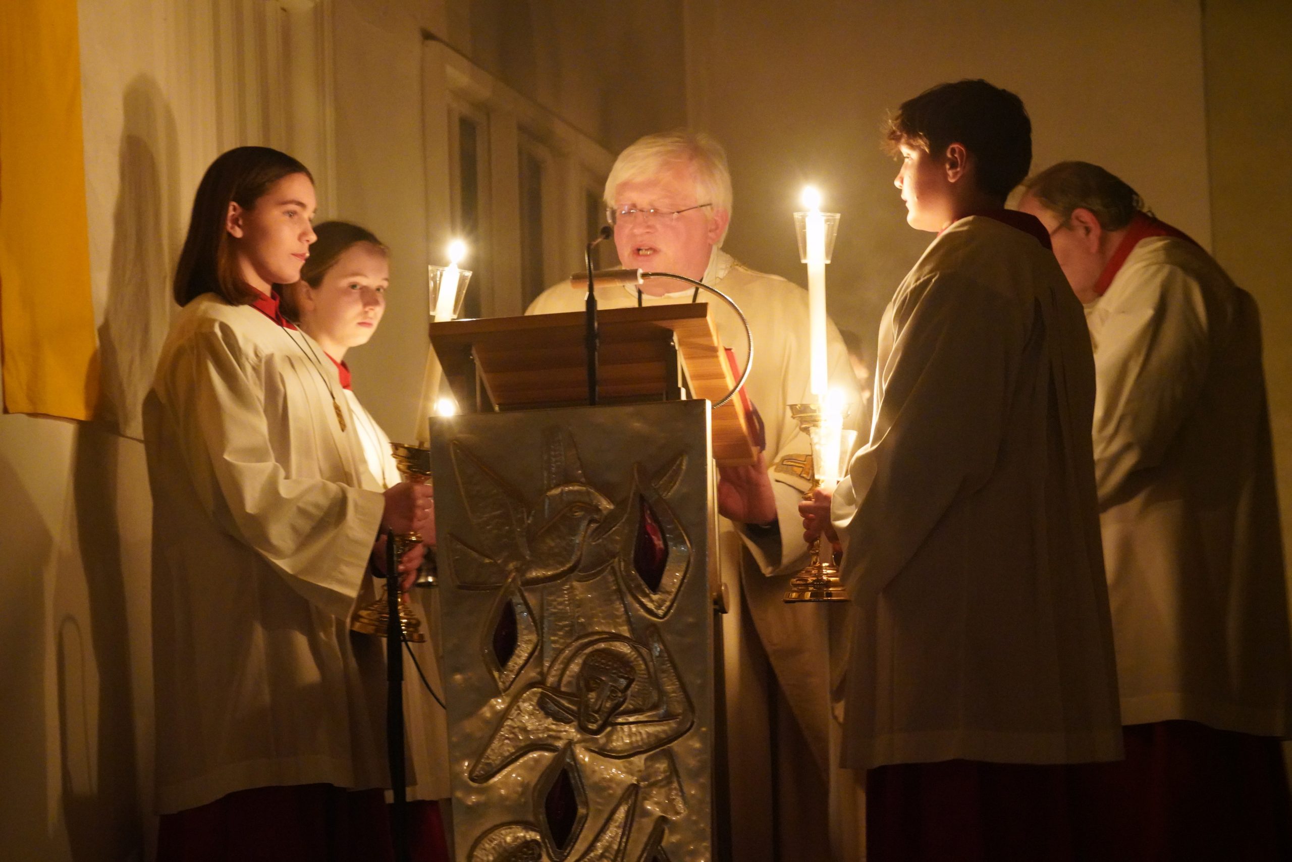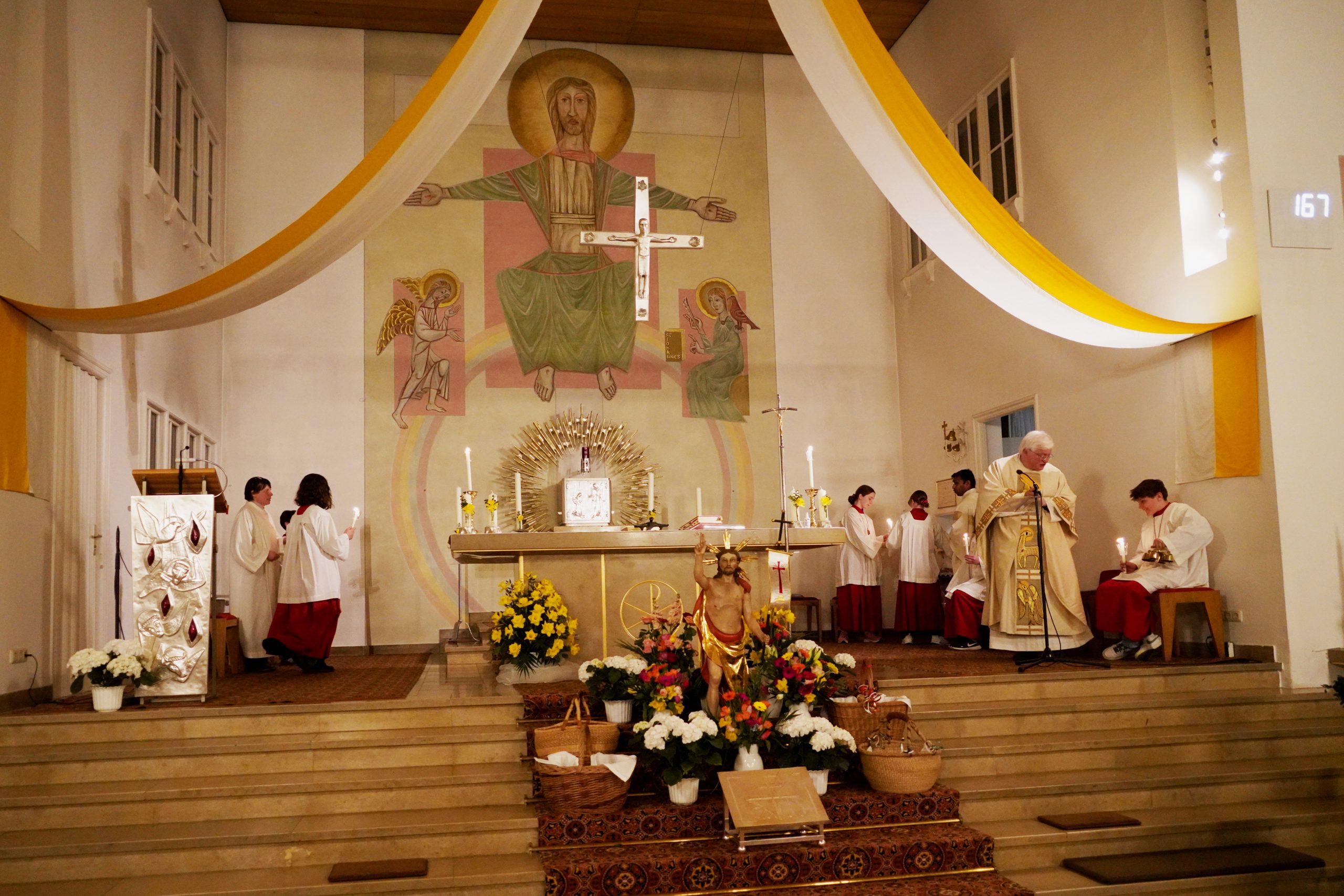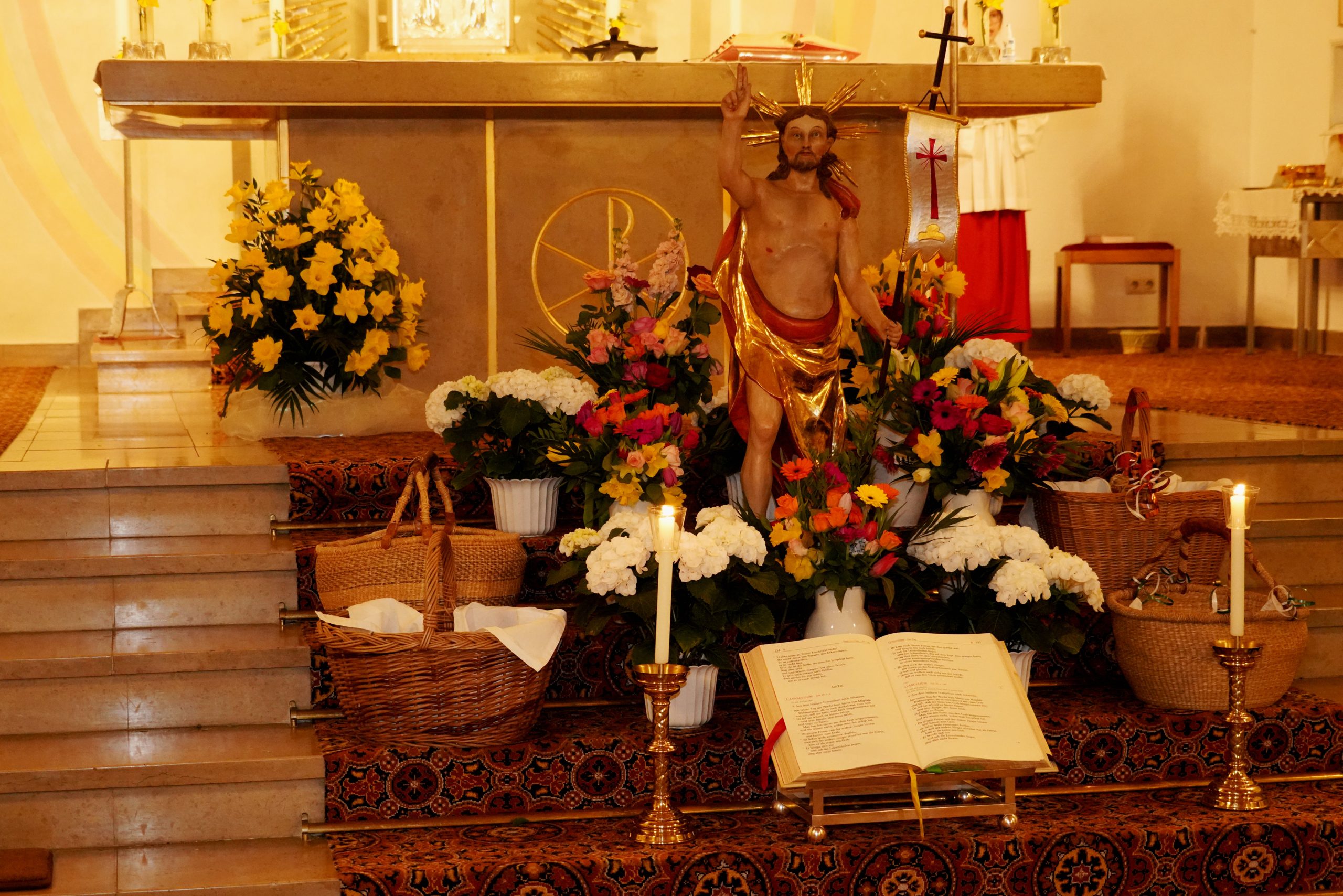 Die Feier der Osternacht wurde mit der Segnung des Osterfeuers und dem Entzünden der Osterkerze auf dem Kirchplatz eingeleitet. Nach den altvertrauten Lesungen ertönte mit dem Gloria wieder die Orgel und alle Glocken läuteten. „Christus ist erstanden“ war die frohe Botschaft der Osternachtfeier, die von Stadtpfarrer Gottfried Schubach, Pfarrvikar Jomet Joy und Chordirektor Peter Kosmus festlich gestaltet und von vielen Gläubigen mitgefeiert wurde.
