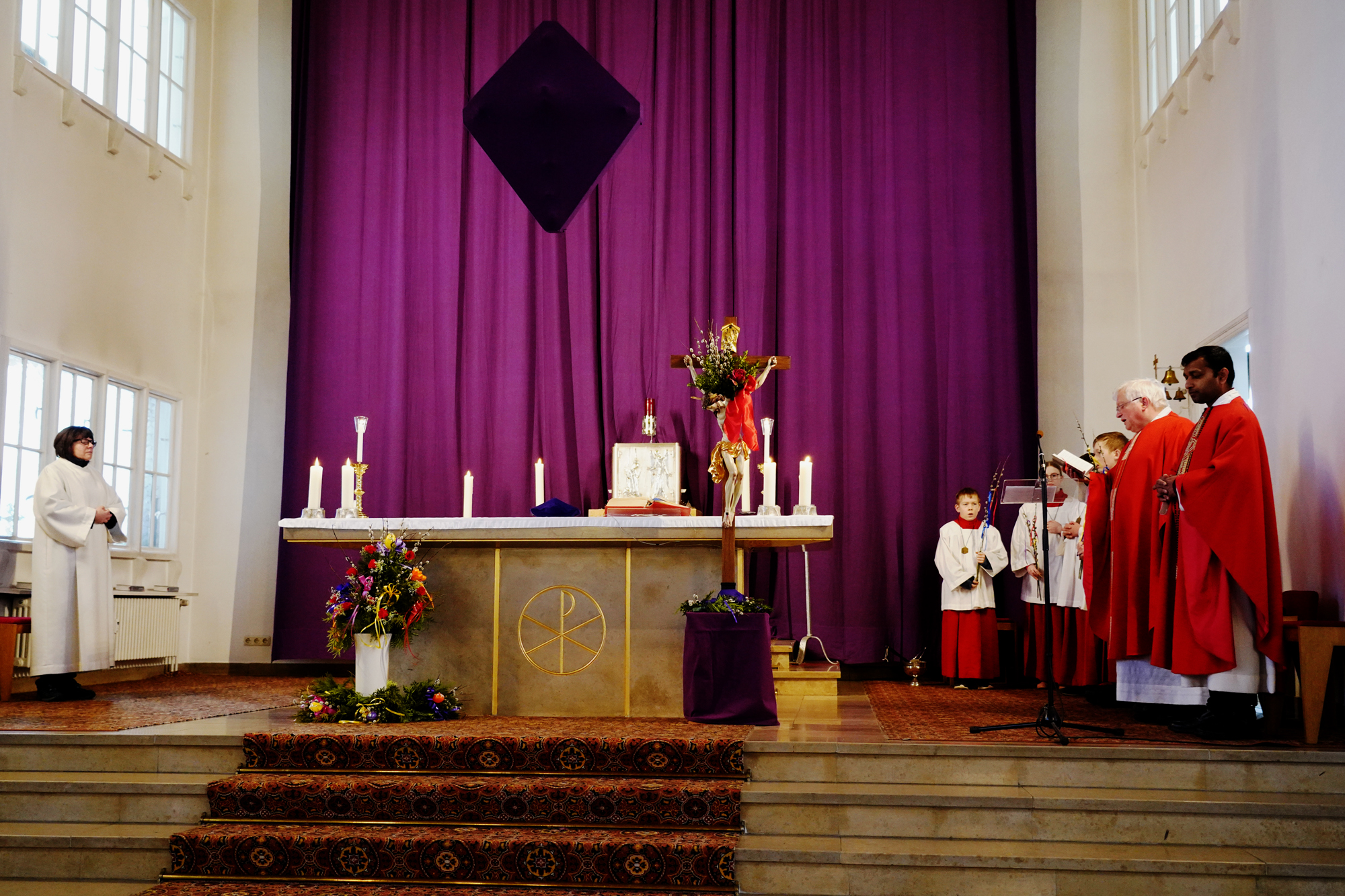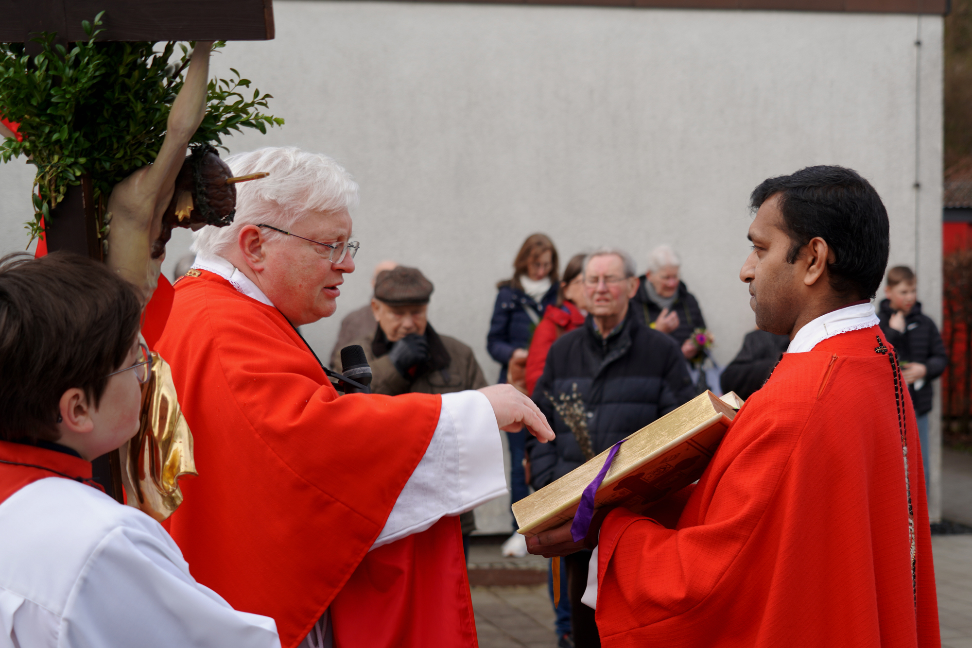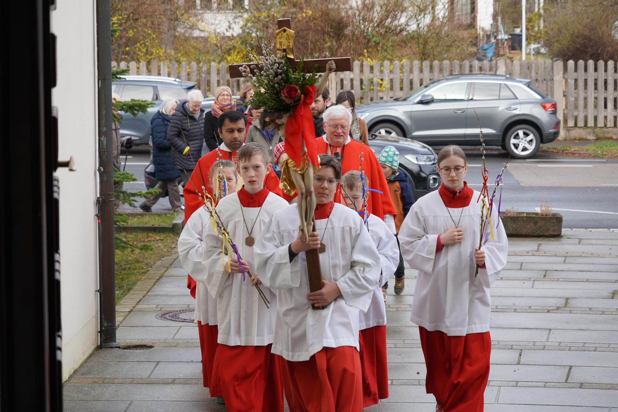 Vor dem Pfarrheim St. Johannes segnete Pfarrer Gottfried Schubach die Palmbuschen und verlas das Evangelium. Anschließend zogen Pfarrer, Pfarrvikar, Ministranten und die Gläubigen mit dem geschmückten Kreuz in einer Prozession hinüber zur Pfarrkirche. Im Mittelpunkt der Liturgie stand dann die Passion, die Geschichte vom Leiden und Sterben Jesu.