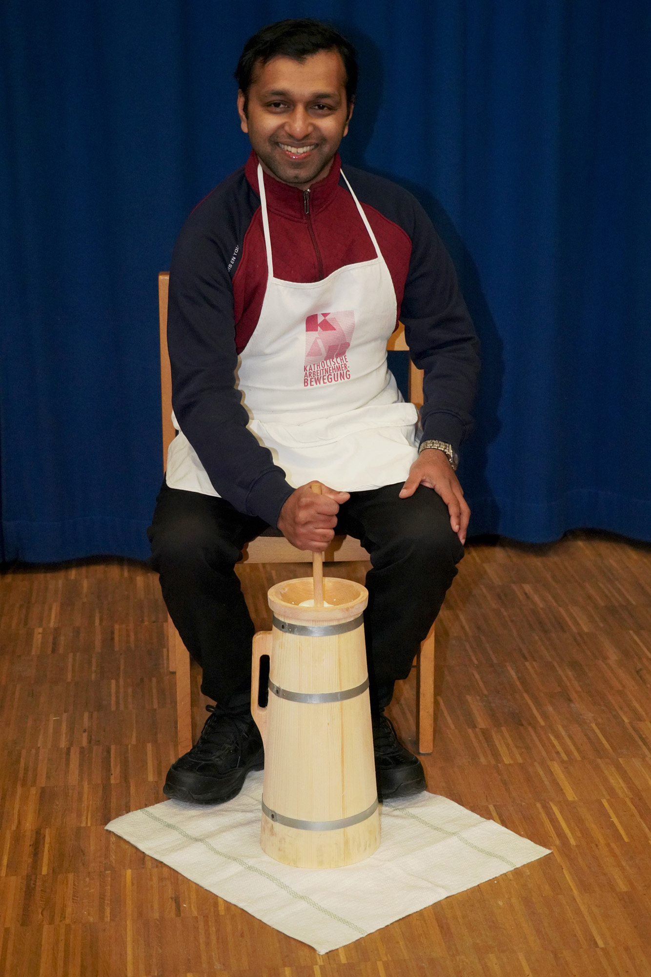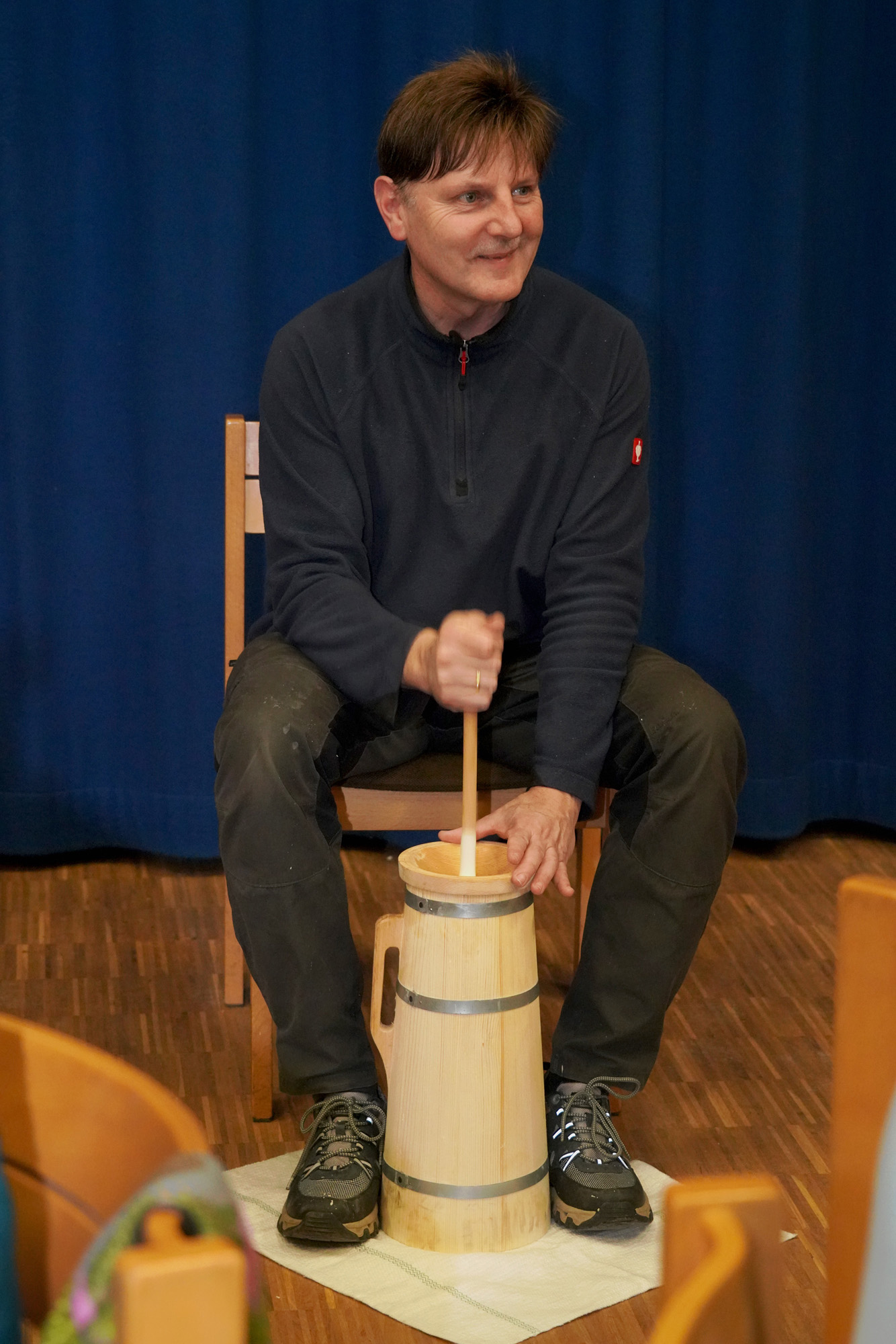 Dann folgte nach alter Tradition die Herstellung des Butters: Dazu wurde die Sahne ins Butterfass gefüllt und kräftig gerührt, bis der Butter von der Buttermilch absetzte und zu einem kompakten Klumpen wurde. Abschließend wurde der Butter in Form gebracht und zusammen mit heißen Kartoffeln, Käse und der frischen Buttermilch serviert.