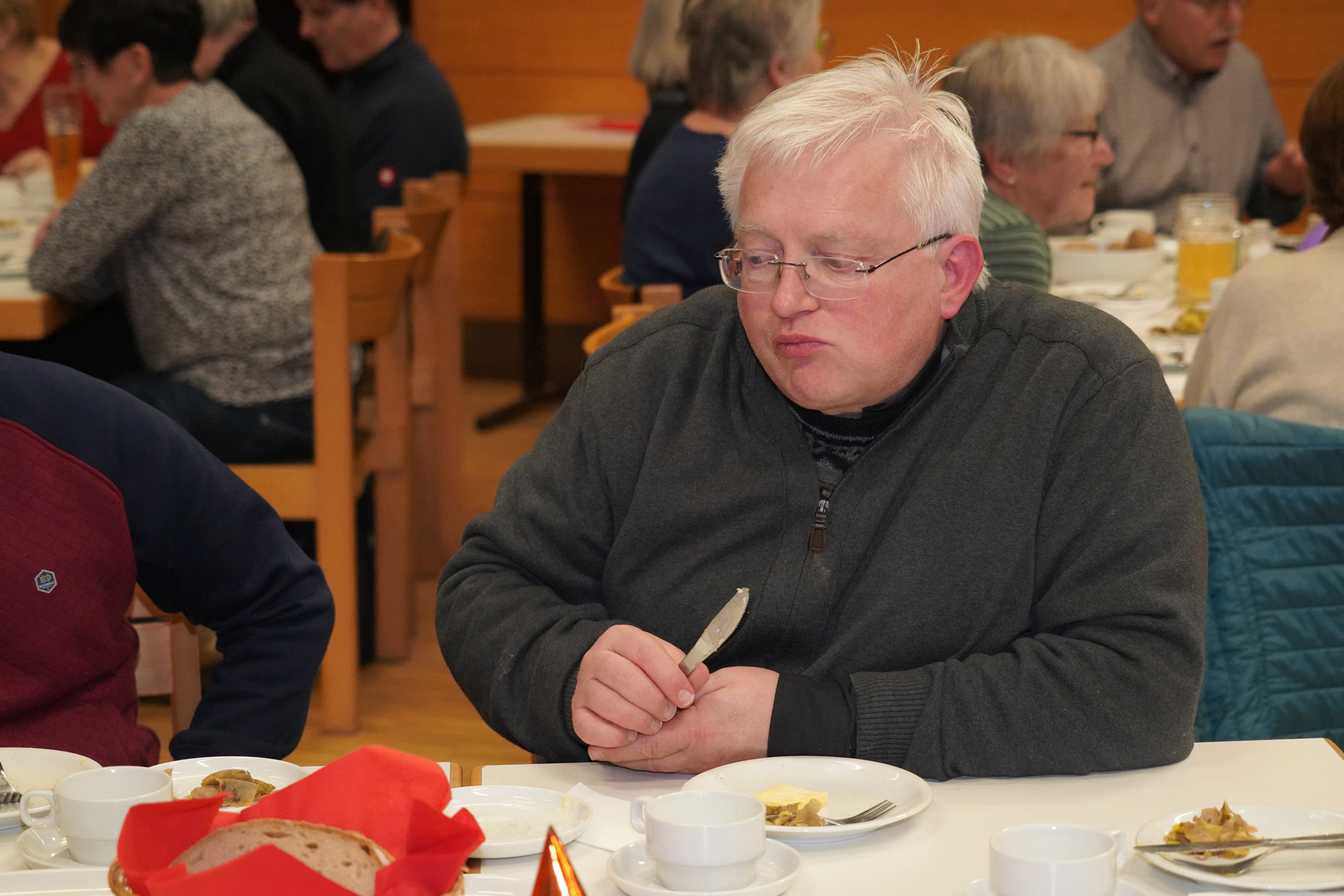 Viele Gäste, darunter Stadtpfarrer Gottfried Schubach und Pfarrvikar Jomet Joy verbrachten im Pfarrheim St. Johannes in Weiden einen gemütlichen Abend mit Ausbuttern. Die Vorsitzenden von KAB und Frauenbund, Hermann Stadler und Doris Zeitler, die mit ihren Vorstandsmitgliedern alles bestens vorbereitet hatten, begrüßten die Gäste und wünschten guten Appetit und einen genussreichen und unterhaltsamen Abend.